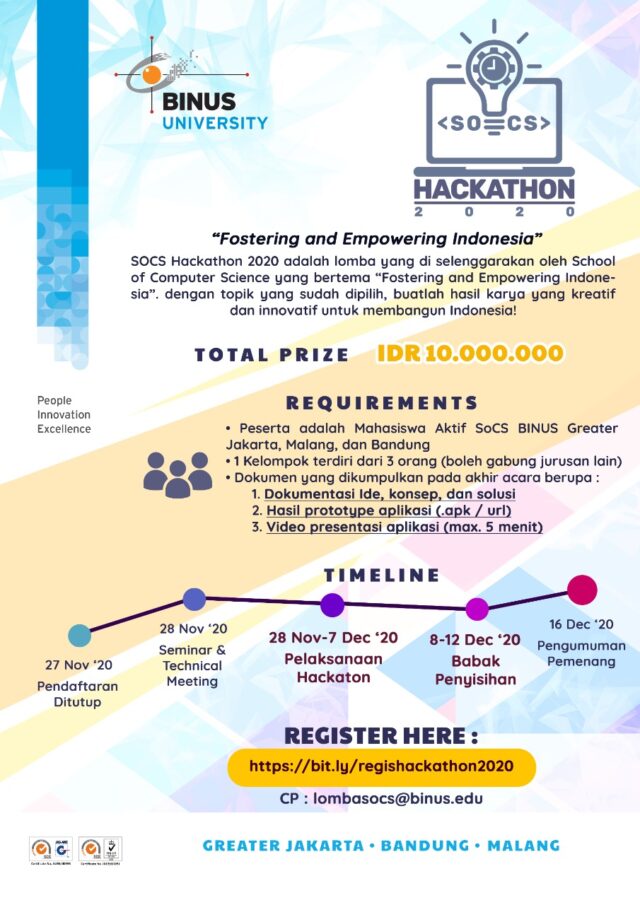 Tunggu apalagi, Yuk Ajak Teman – teman Binusianmu untuk bergabung dalam SoCS Hackathon 2020!