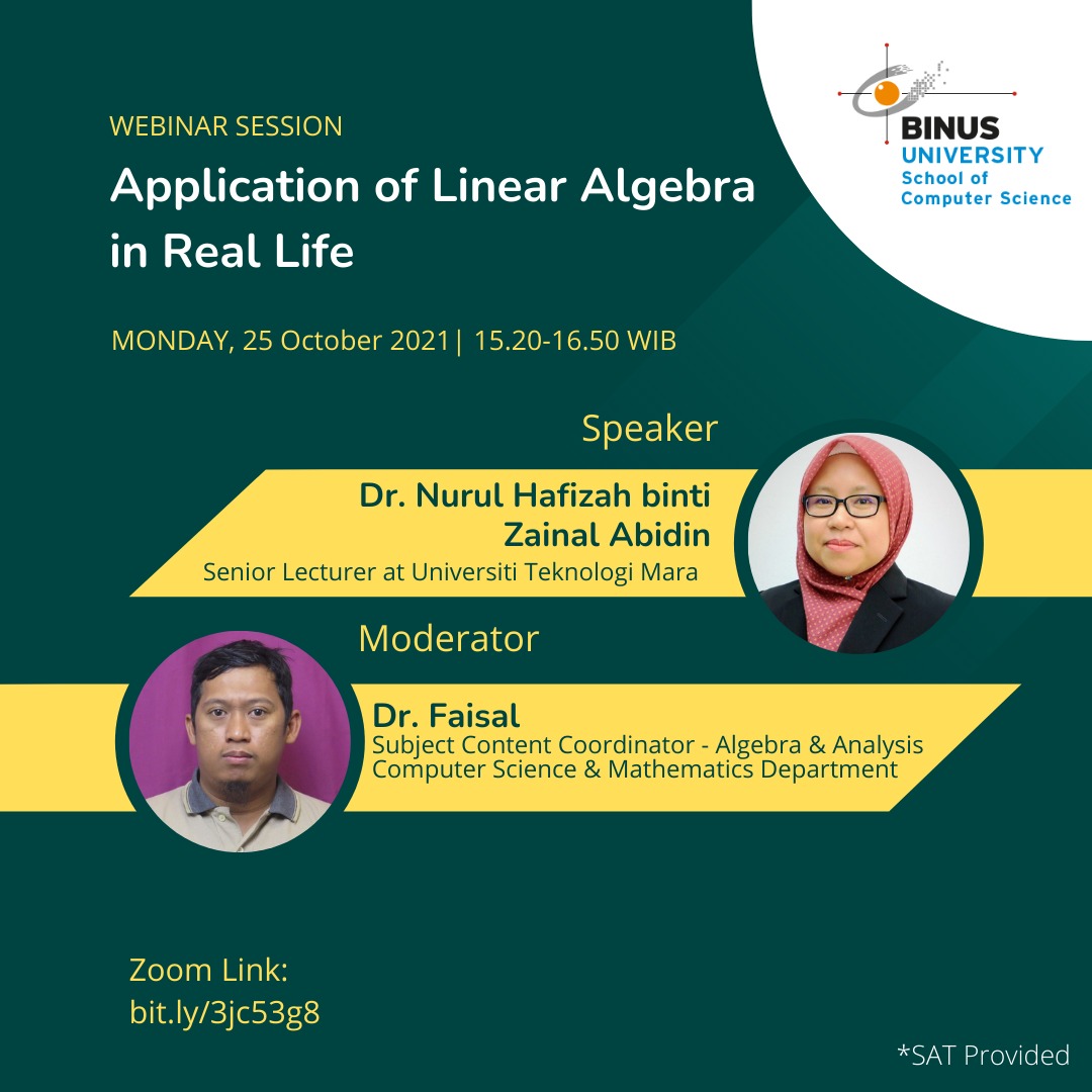 Teman-teman pasti sudah tidak asing lagi dengan Linear Algebra. Namun apakah teman-teman tahu bagaimana linear algebra diterapkan dikehidupan kita sehari-hari dan khususnya di pengembangan teknologi? Dr. Nurul Hafizah UiTM Malaysia akan menjelaskan kepada kita bagaimana cara untuk mengaplikasikan linear algebra pada kasus-kasus nyata.