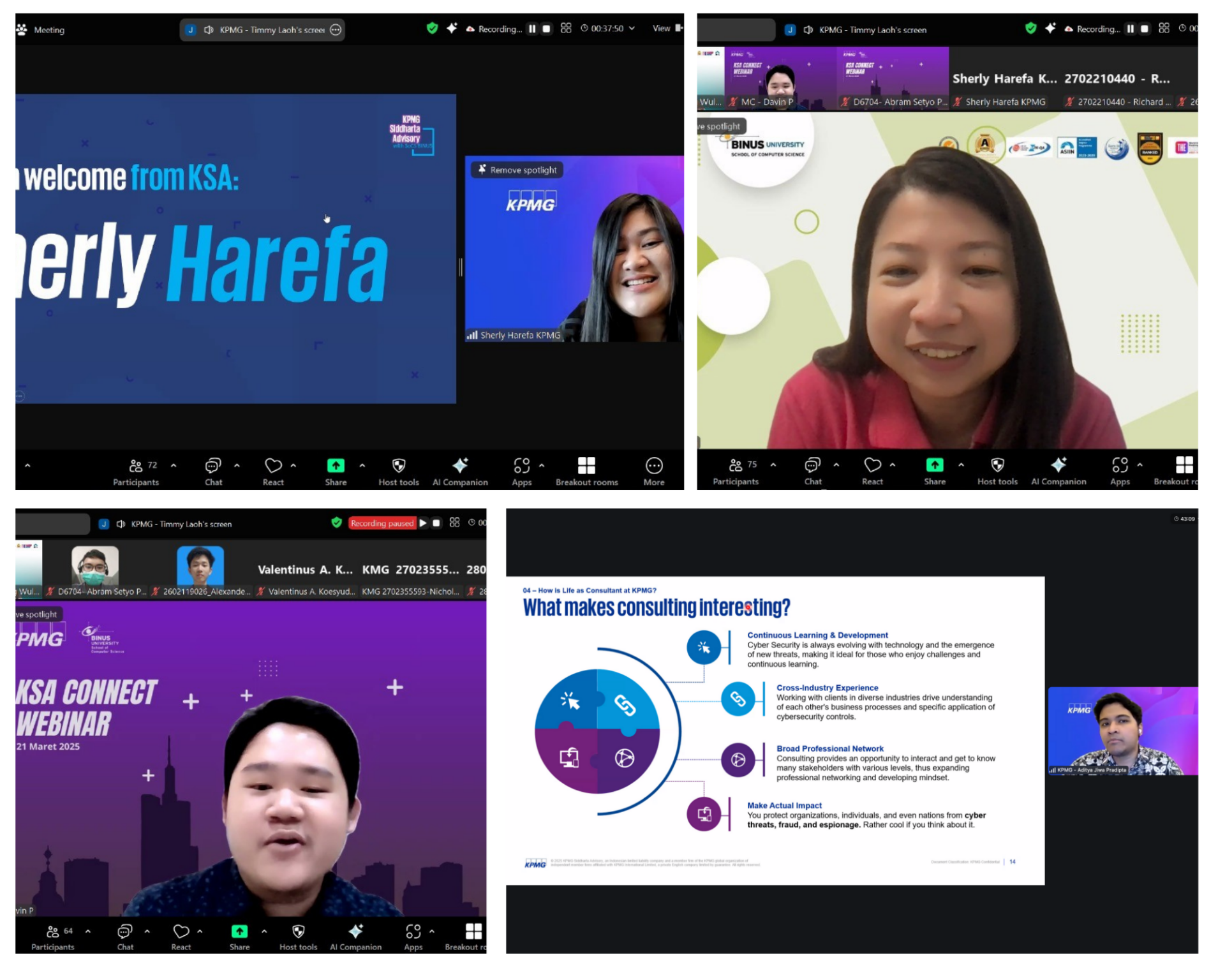 Jakarta, 21 Maret 2025 – School of Computer Science (SoCS) BINUS University sukses menyelenggarakan webinar bertajuk “KSA Connect Webinar with BINUS – KPMG Siddharta Advisory”. Acara ini merupakan kolaborasi antara SoCS BINUS dan KPMG Siddharta Advisory (KSA) yang bertujuan untuk memberikan wawasan mengenai peluang karier serta tren terbaru di bidang Digital Trust, Cybersecurity, dan IT-Enabled Transformation.