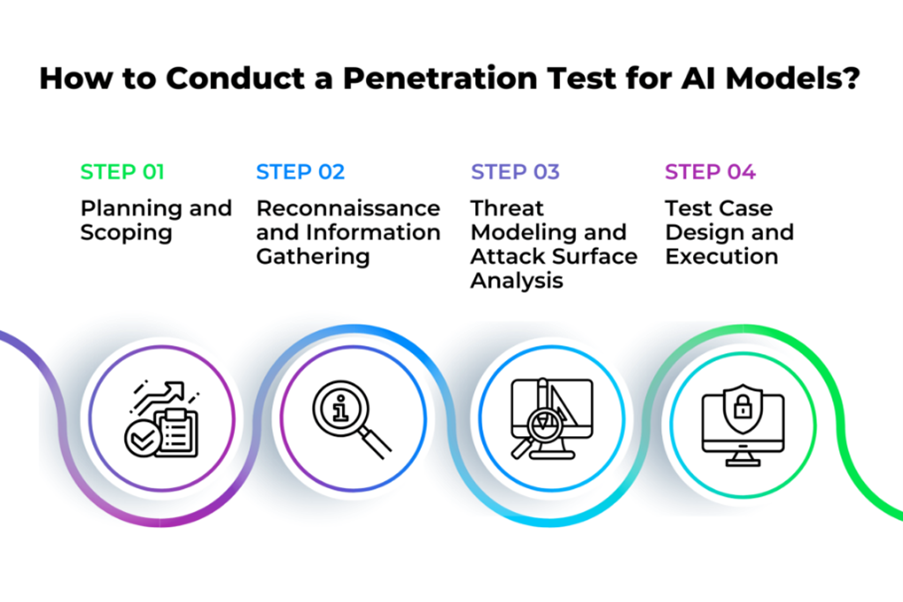Melakukan penetration testing terhadap model AI membutuhkan pendekatan yang sistematis namun fleksibel karena karakter sistem AI tidak selalu deterministik. Berdasarkan tahapan standar seperti yang ditunjukkan dalam ilustrasi, proses pengujian dapat dibagi menjadi empat langkah utama yang berkesinambungan, yaitu sebagai berikut (Ilhan, 2023):