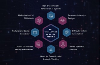 AI penetration testing membawa tantangan unik yang tidak ditemukan dalam pentest tradisional. Seperti ditunjukkan dalam ilustrasi berikut, banyak hambatan teknis dan konseptual yang harus diperhitungkan (Dzemidovich et al., 2025):