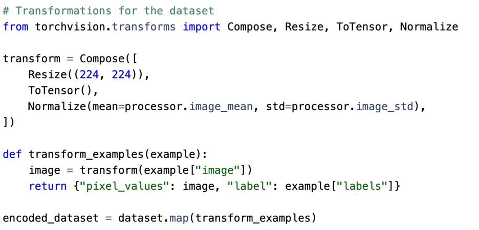 Langkah berikutnya adalah memetakan label, membagi dataset (train/test), dan menyiapkan fungsi transformasi gambar menggunakan torchvision.transforms.