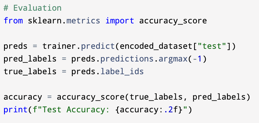 Setelah training selesai, kita bisa melakukan evaluasi dengan metrik seperti akurasi dan F1-score. Kita dapat menggunakan library sklearn.metrics.
