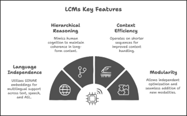 Pada artikel analisis teknis yang diterbitkan oleh Shrikhande (2025) di ADaSci, dijelaskan bahwa LCMs dirancang bukan hanya untuk menghasilkan teks, tetapi untuk merepresentasikan dan memproses konsep secara efisien, manusiawi, dan fleksibel. Dengan mengandalkan embedding semantik yang canggih seperti SONAR, LCM mengubah pendekatan pemrosesan bahasa alami menjadi lebih hierarkis dan terorganisir. Keunggulan ini tercermin dalam empat fitur utama yang membedakan LCM dari pendekatan model bahasa konvensional. Berikut adalah empat fitur kunci dari LCMs.