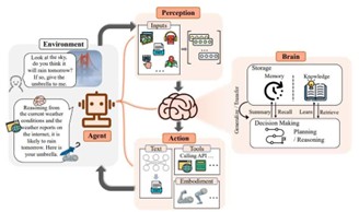 Diagram berikut menyajikan alur kerja konseptual dari LAMs sebagai agen otonom. Model menerima input dari lingkungan (teks, gambar, sinyal UI), kemudian memprosesnya melalui komponen persepsi dan memori. Dengan landasan pengetahuan dan pengalaman sebelumnya, model mengambil keputusan, menyusun rencana, dan akhirnya mengeksekusi aksi dalam bentuk interaksi langsung terhadap lingkungan digital atau fisik.