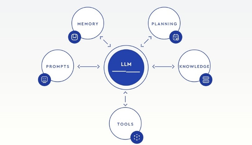 Sebelum memahami bagaimana LAMs mengembangkan kemampuan tindakan, penting untuk memahami keterbatasan pendekatan LLMs saat ini. Gambar berikut memperlihatkan arsitektur dasar LLMs yang mengandalkan ekosistem komponen eksternal untuk memperluas kemampuannya, seperti perencanaan, memori, alat bantu, dan basis pengetahuan. Namun, hubungan antara elemen-elemen ini masih bersifat modular dan tidak selalu terintegrasi secara konseptual dalam pemrosesan aksi.