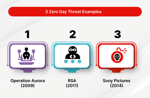 - RSA (2011): Perusahaan keamanan RSA menjadi korban serangan zero-day yang memanfaatkan celah pada Adobe Flash Player. Penyerang mengirimkan email berisi lampiran Excel yang ditanamkan file Flash berbahaya. Ketika karyawan membuka dokumen tersebut, komputer mereka langsung dikuasai penyerang yang kemudian mencuri data terkait produk SecurID, sistem autentikasi dua faktor yang sangat sensitif. Serangan ini menunjukkan bagaimana teknik rekayasa sosial (social engineering) dapat digabungkan dengan eksploitasi zero-day untuk melumpuhkan perusahaan keamanan sekalipun.