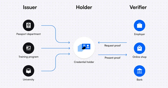 Figure 2. Alur interaksi antara issuer, holder, dan verifier dalam sistem DID. (https://www.dock.io/post/decentralized-identity)