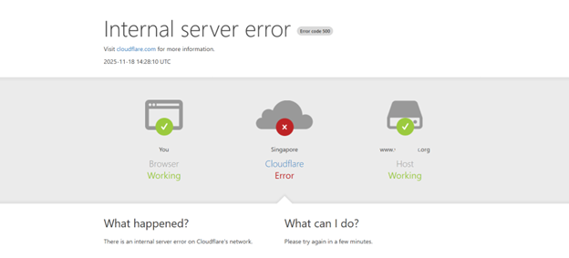 [1] Cloudflare Global Network experiencing issues: Incident Report for Cloudflare. Cloudflare System Status. Retrieved from: https://www.cloudflarestatus.com/incidents/8gmgl950y3h7 on 20 November 2025