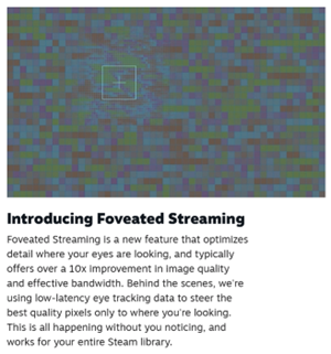• Streaming game PC ke headset menjadi lebih efisien karena bagian yang dilihat pengguna dikirim dengan kualitas tinggi, sedangkan bagian lain bisa di-adjust tanpa terasa oleh pengguna.