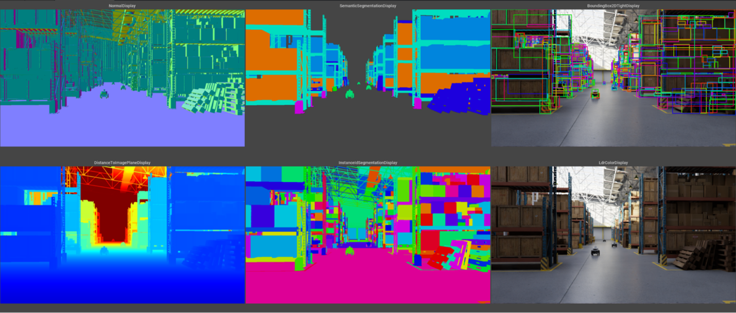 Figure 1. Enhanced sensor annotations dalam simulasi gudang menggunakan Omniverse Replicator (https://developer.nvidia.com/blog/build-custom-synthetic-data-generation-pipelines-with-omniverse-replicator/)