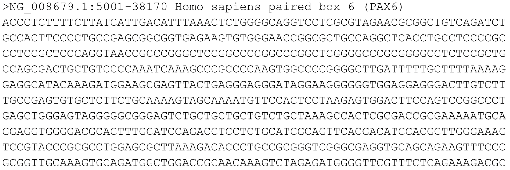 Contoh file FASTA menunjukkan gen PAX6 (https://compgenomr.github.io/book/fasta-and-fastq-formats.html)