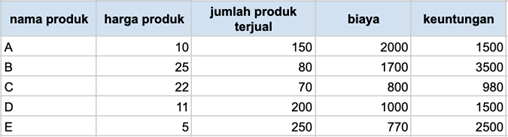 Kita ambil contoh dalam bidang bisnis, bagaimana ketiga tugas ini dapat berperan. Misalnya anda memiliki bisnis yang menjual 5 produk. Anda adalah pengusaha yang sudah memiliki data driven perpective sehingga anda mengumpulkan data mengenai transaksi terhadap ke 5 produk ini, mencakup harga, jumlah penjualan, biaya yang diperlukan untuk setiap produk dan keuntungan yang diperoleh, sampel data diberikan pada Tabel 1.
