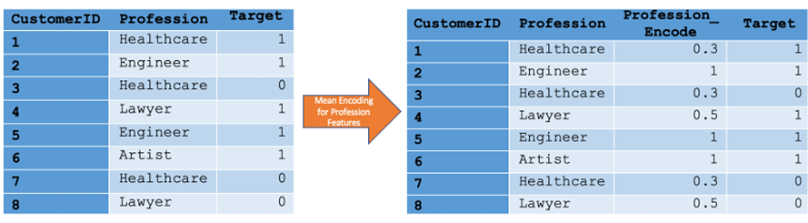 1. Mean Encoding. Mean Encoding adalah teknik yang cocok untuk klasifikasi, karena menggabungkan nilai label target dalam proses encoding. Mean Encoding melibatkan perhitungan rasio frekuensi setiap nilai dalam data kategorikal dengan label 1 terhadap total nilai frekuensi. Contoh berikut akan memberikan ilustrasi cara memperoleh mean encoding. Diberikan sample data Profesi dengan label biner 1 dan 0, disajikan dalam Tabel 1. Nilai hasil encoding untuk setiap nilai data kategori ditunjukkan dalam Persamaan 1.