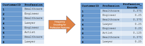 1. Frequency Encoding. Pemanfaatan frequency encoding berlaku dalam skenario masalah yang tidak memiliki variabel target. Perhitungan encoding ini berasal dari perbandingan antara frekuensi nilai tertentu dalam data kategorikal dan keseluruhan data sampel. Konsep ini dijelaskan melalui contoh ilustratif yang disajikan dengan contoh data pada Tabel 2 dan perhitungan dalam Persamaan 2.