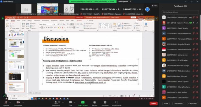 Pada Selasa, 26 September 2023 tim dari RIG Geospatial and Economics AI Universitas Bina Nusantara yang diwakili oleh Bapak Fabian Surya Pramudya, Ph.D. melakukan pelatihan untuk Pembuatan Desain Sistem Peringatan Dini Kesehatan Tanaman. Kegiatan ini dihadiri oleh Mahasiswa, Asisten Peneliti, dan Dosen pembimbing mahasiswa Enrichment untuk Track Riset yang tergabung dalam kegiatan Kedaireka 2023 ini. Kegiatan ini dilakukan untuk memandu mahasiswa secara dalam memanfaatkan Dataset PTPN IV untuk Penelitian Geo-AI menggunakan ArcGIS, mulai dari pembersihan data, anotasi, pembuatan model, dan publikasi hasil pemodelan dalam aplikasi berbasis web.