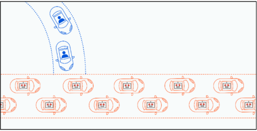 penyerang. Mobil-mobil oranye tersebut memenuhi seluruh jalur sehingga menciptakan kemacetan total. Akibatnya, mobil biru sebagai pengguna sah tidak lagi dapat bergerak bebas. Situasi ini menggambarkan bahwa dalam serangan DDoS, permintaan palsu yang datang dalam jumlah besar dan dari banyak sumber secara simultan akan menghalangi pengguna sah untuk mengakses layanan karena sumber daya sistem telah sepenuhnya diserap oleh trafik berbahaya tersebut. Dengan demikian, analogi kemacetan ini memperjelas bagaimana DDoS bekerja, semakin banyak trafik palsu yang dikirimkan, semakin lumpuh sistem target dalam melayani permintaan yang sebenarnya valid.
