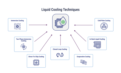 Figure 2. Berbagai teknik liquid cooling untuk pusat data modern (https://www.tierpoint.com/blog/data-center-liquid-cooling/)
